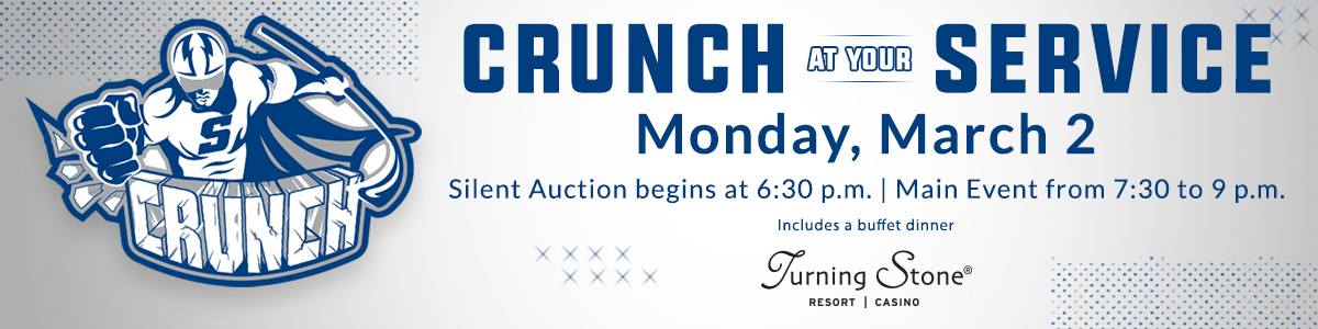 Welcome to Crunch at Your Service at Turning Stone Resort Casino. The silent auction will close at 8 p.m. and will be run through GiveSmart. Cash, credit and check are accepted for items. If you are planning to play with credit fees will apply. If you are paying with check or cash please come to the checkout table located in the Mohawk room to claim your prize.