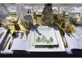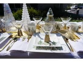 Your Christmas table has never looked so fancy! This complete tablescape includes an eight setting plate set with dinner and salad plates as well as mugs all with a peaceful winter tree print. You will also have eight gold rimmed wine glasses, a 40 piece gold flatware set, 8 white napkins, 8 tree candles and 5 glass trees for your centerpiece. Your guests will feel like royalty as you dine this holiday season. Restrictions: Subject to sales tax.