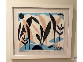 Original artwork by local Atlanta artist, Jana Young Siegel. "Hillside in Highlands" is a 26x30" ink & acrylic on paper, cut and collaged. Art is framed floating in a white frame.