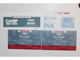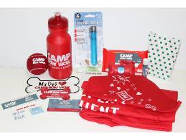 Camp Bow Wow gift set for your pup. Set includes 2 days of camp, a bath and a nail trim, wipes, a camp t-shirt, a bandana, water bottle, toy ball, poop bags, dog bubbles, and more.
