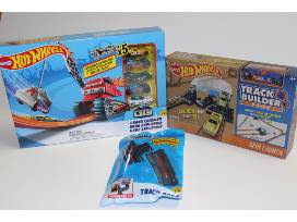 Hot Wheels 5 car track set, track builder with 1 car, and a track pack.