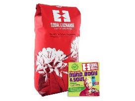 Equal Exchange is local, worker-owned coop with Organic and fairly traded products from small scale farmers around the world. Enjoy a 5lb bag of whole bean coffee (Mind Body and Soul - a blend of medium and vienna roasts) and a case of 12 Very Dark (71%) chocolate bars.