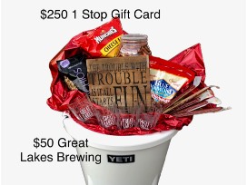 Be ready for tailgating and the holidays! Includes Yeti Tank 45 Ice Bucket, $250 gift card to 1 Stop Wine, Beer and Spirits in Avon, $50 gift card to Great Lakes Brewing Company, four 16 oz. pint glasses etched with the CLE skyline, one dozen beef sticks locally made in Northeast Ohio, XL bag of Smokehouse Almonds, XL bag of Wonderful pistachios, and pub snack mix. Donated by Lisa Zidar, Brenda Norton, Dan and Mary Jo Sustar, and Blessing House Summer Party