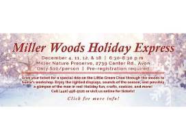Grab your four tickets for a special ride on the Little Green Choo through the woods to Santa's workshop on Friday, December 18, 2020 at 7:30 p.m. in Miller Wood Nature Preserve in Avon. Enjoy the lighted displays, sounds of the season and possibly a glimpse of the man in red. Tickets include one train ride per person, a cup of hot chocolate, and cookies. This event will also offer holiday-themed crafts and fun.