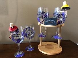 $50 gift card for Giuseppe's Wine Cellar in Amherst, four hand-painted wine glassses, wine glass holder and two wine corks