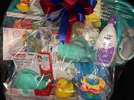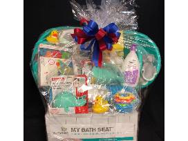 Scrub a dub dub with this basket full of everything needed for baby bath time. It features a baby bathtub, towels, lotions, toys and more. This would make a perfect gift for a baby shower and new parent.