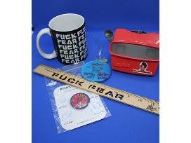 A fun grab bag of Church merch from neighborhood favorite Sister Louisa's Church of the Living Room & Ping Pong Emporium. Lot includes viewfinder, 2 shirts (size options are unisex Small and unisex XL), measuring stick, mug, pop socket, and luggage tag.