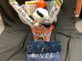 If your family loves sports and being active, this basket is for you! Includes: (4) Utah Grizzlies Hockey Tickets, Utah Grizzlies blanket, Utah Grizzlies puck, Utah Jazz bag, Nike soccer ball, basketball hoopster with mini basketballs, football, kickball, badminton rackets with birdie, Jazz fan noodles, jump rope, and Chinese jump rope.