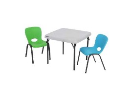 Your kids will love sitting at a table sized perfectly for them! This set includes a Lifetime Kids card table, (2) blue stacking chairs, and (2) green stacking chairs.