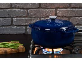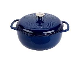 LODGE Enamel 6-Quart Dutch Oven in indigo blue. NOTE: This item has a small cosmetic defect on the lid's outer enamel, but it should not affect the quality or use of this product.
