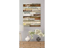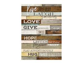 Give yourself a daily pick-me-up with this plaque wall art's inspirational messages. Lifted wood planks read "Live joyfully. Laugh abundantly. Love affectionately. Give generously. Care deeply. Smile spontaneously. Hope eternally. Listen carefully. Forgive freely. Play adventurously. Hug tightly and always remember that tomorrow is a new day. Measures 24"H x 18"W x 1.25"D