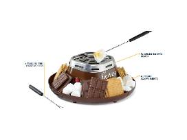 No fire needed! Includes a Nostalgia Electric S'mores Maker, packable Eddie Bauer throw blanket, graham crackers, marshmallows, Hershey's bars, and hot cocoa mix.