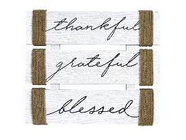 Turn your house into a home with a shiplap style sign that says "Thankful, Grateful, Blessed" and a Scott Living decorative dried fill in Rust Oasis color.