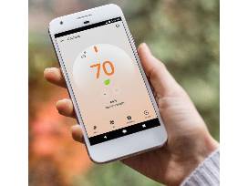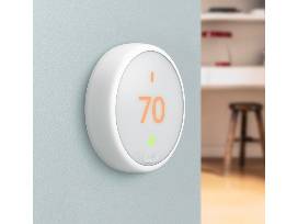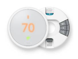 The Nest Thermostat E turns itself down when you're away. You can control it from anywhere. And its frosted display is beautifully designed to blend right in.