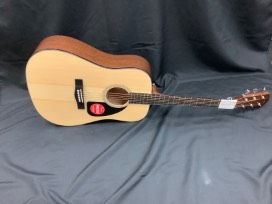 Get ready to rock and roll with this Fender CD-60 acoustic guitar with case, "Beginning Folk Guitar" book, and guitar stand.