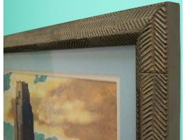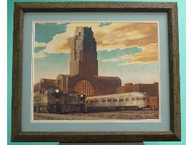 This original 1953 calendar print by famed New York Central System (NYCS) artist Leslie Ragan depicts engines midway on the Water Level Route in Buffalo, New York. Framed using conservation-grade archival materials, it measures 22.5 inches wide x 19 inches long. Not a reproduction.