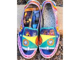 I used Golden OPEN acrylic paints. I thought about the painted mini-buses of the time, how they were painted and who painted them. I put myself into that character and just "went for it". I didn't want to overthink the design. That said, I wanted to use colors representative of that time and tried to make the shoes look spontaneous while carefully considering a finished project! I just wanted them to be "groovy"!