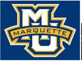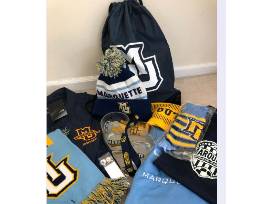 Marquette University Spirit Wear: winter hats, a pair of socks, a knit scarf, a rally t1owel, earbuds, a lanyard, and a drawstring bag, 1 short sleeve soccer tshirt (size adult S), 2 long sleeve soccer tshirt (size adult XXL) and 2 MU High Ball Glasses.
