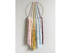 This dream catcher consists of soft colors of the rainbow, hand braided and woven onto a 12" brass hoop. This textural piece is an original design and measures almost 3 feet tall.