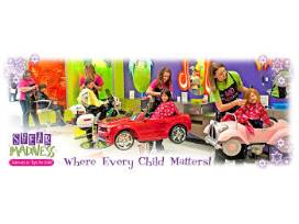 With mounted vehicles for styling chairs, televisions, DVD's, XBOX players, a toy store in the waiting area, and regular styling chairs, their salons serve as fun centers that provide a positive distraction for a great experience. They are a completely green salon, so they don't use any harmful dyes or chemicals.