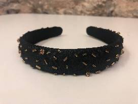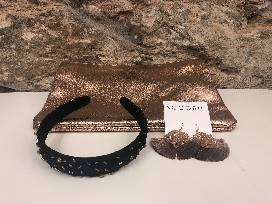 Includes embellished headband, sparkle fringe earring and rose gold clutch