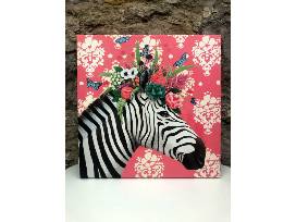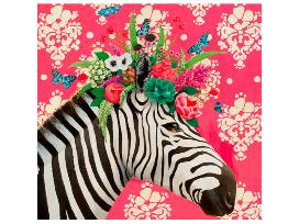 Wall art by Heather Gauthier featuring a striped zebra balancing a beautiful bouquet of flowers atop it's head. Set against a bright pink background the contrasting colors and patterns in this piece make it both stunning and unique.