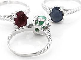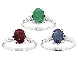 - 4.50ctw Set of 3 Oval Emerald, Ruby & Blue Sapphire Sterling Silver Solitaire Rings