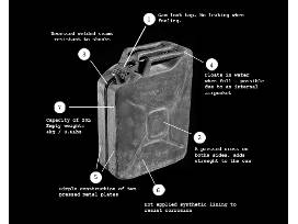 The ID tag on top of the design is from the octane tag during World War II. Each Jerry Can has it´s own unique number and matching number which appears on the certificate, with your name and date of purchase.