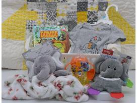 This basket is filled with cute little elephant-themed items, perfect for your baby or as a gift for parents-to-be.