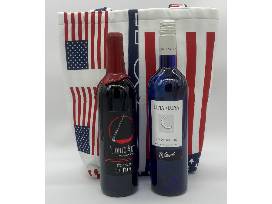 Celebrate the stars and stripes with this beautiful, handmade lined tote with US flag insignia design containing red and white wine and glasses.