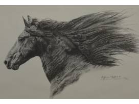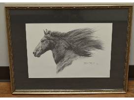 This is a beautiful equestrian print depicting a Fresian Stallion by artist Sheri Greves-Neilson, signed "S Greves-Neilson" on the lower right of the image. Professionally matted and framed, it's ready to display in your home or office.