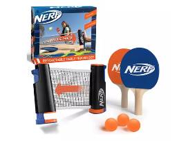 With Nerf's Retractable Go Anywhere Table Top Tennis Game, you don't need to bother with bulky ping pong tables. Easily convert your dining table, picnic table, or any other table with a width up to five feet into a DIY ping pong table! Set up and start a match in a matter of seconds. The net stretches up to five feet but can be attached to smaller width tables. Simply extend the net to the desired width and use the trigger clamps to attach the net to the table, and you're good to go! With the included two paddles and three ping pong balls, you'll be ready to play in no time! The retractable net is ITTF regulation height and width, so play like a pro.