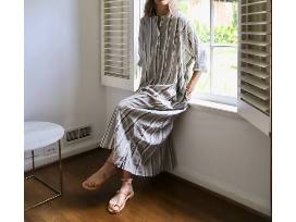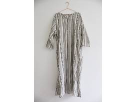 Roomy caftan in 100% organic Japanese cotton - thick gray woven stripe, narrow stripes on an off-white background. Deep front placket with vintage shell buttons. Extra-wide, loose cut - roomy fit, pulls over. Bracelet length sleeves can be rolled up or down. Notched hem, hidden pockets. One size fits most.