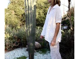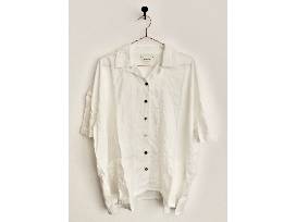 Collared, short-sleeve button-front shirt, size small, in soft, puckered Japanese cotton voile. Extra wide silhouette, oversize easy fit. Closes at neck with a loop and vintage shell button, front patch pockets. Cuffs at sleeves, wear rolled up or down.