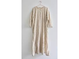 Tunis Caftan - Sand Souk Stripe. Roomy caftan in 100% organic Japanese cotton. Thick and thin woven sand-colored stripes on an off-white background. Deep front placket with vintage shell buttons. Extra-wide, loose cut - roomy fit, pulls over. Bracelet length sleeves can be rolled up or down. Notched hem, hidden pockets. One size fits most.
