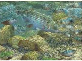 Beautiful art for the fisherman or nature lover. Image depicts an underwater scene of a striped bass about to feed on a smaller fish. Delicate hues of underwater tones.