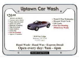 Uptown Car Wash delivers fast and friendly service without the high pressure sales environment. This package includes 5 Basic hand car washes which take about 15 minutes.