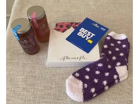 Start with a $50 gift card to Best Buy to indulge your inner techie and then cozy up with comfy socks, "If the Crown Fits" stationery, and delicious Bee Harmony Honey with hints of blueberry and berry.