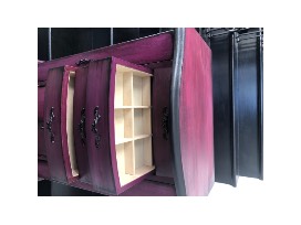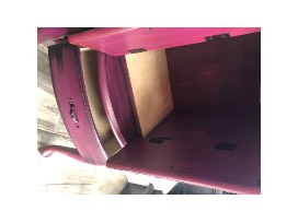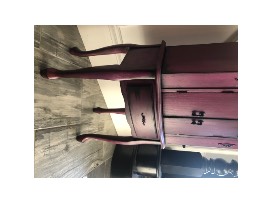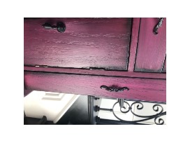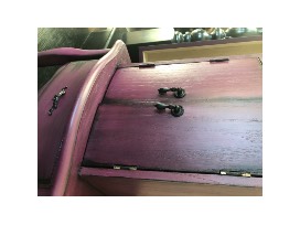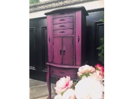 A freestanding wooden jewelry armoire (storage cabinet) that has been refinished in bright, deeply saturated shades of purple and pink, with even a bit of red added to its base coat. A black glaze has been applied and allowed to settle into the corners. It has been sealed with a polycryllic clear coat. The original hardware has been painted black. The hinges of the front doors are bronze/black. It's fully functional with a lot of storage. The top lifts up to reveal a glass mirror. The side doors open by swinging out to the side, with hooks inside for necklaces, etc. Dimensions are 39" high x 13" deep by 17" wide. Weight is 37 lbs.