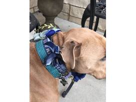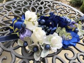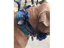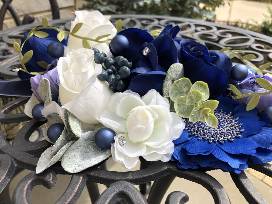 A flower necklace makes a lovely adornment for your furbaby on their birthday or gotcha day, or for family pictures or celebrations of any kind! This wintry blue mix would be beautiful during the upcoming holidays. Glittery green foliage, white roses, metallic berries and small rhinestones mix up the blooms of blue. This accessory ties with ribbons around your dog's neck, making it adjustable. It can be easily worn in addition to a collar. The approximate measurements are: 11" width (left to right as you look at the front of the necklace) 7" length (top to bottom) 3" depth (the height or projection of the tallest flower) The ribbon ties are each 13" for a total of 26". Added to the 8" width of the backing of the flower necklace, the total circumference is 34" around.