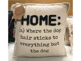 0- This pillow features the phrase: "Home: Where the dog hair sticks to everything but the dog."