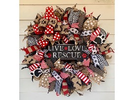 - 25" mesh wreath. Made with deco mesh. Decorated with wired ribbon, wood dog paws, an a bone shaped Live Love Rescue sign