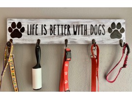 - 26" wood farmhouse style dog leash board. Hand painted, 5 metal hooks, hangs with 2 sawtooth hangers on the back