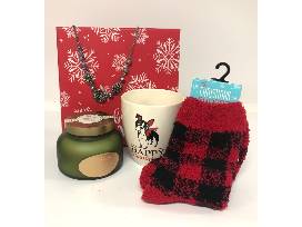 The perfect Secret Santa gift for anyone this holiday season! Includes: Candle, Adorable Mug, Socks and Jewelry.