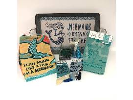 Every mermaid needs this gift basket! Decorative Tray, Dish Towels, Socks, String Lights and Ornaments.
