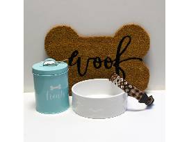 Get all the essentials to spoil your pup with this basket! Includes: "Woof" mat, treat jar, ceramic dog bowl and Amor collar! Size Medium AMOR dog collar. These collars are handwoven by Maya artisans in Mexico. Each purchase empowers women and preserves cultural heritage. Size medium collars fit a 13" - 17" neck and are 1.4" in width