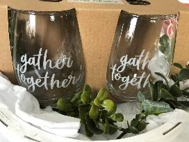 Includes Two Each: Green Pumpkin Shaped Appetizer Plates, Hand Towels, and Stemless Wine Glasses Embossed With "gather together".