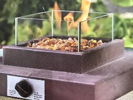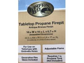 Antique Bronze Finish. Assembled Dimensions 14 in.W x 14 in. L x 6.7 in. H; For Use On Table Tops With Umbrella Holes; Adjustable Flame; Decorative Fire Glass Included.