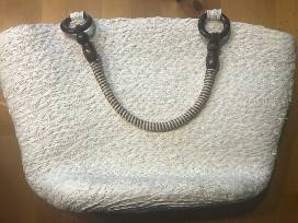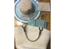Arianna Ivory Color Weaved Sun Purse by Howard with Matching Blue/Ivory Sun Hat, Scarf and Necklace; ECO Tan Makeup Bag
