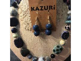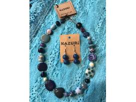 Kazuri Necklace and Matching Earrings Accompanied by an Aqua Blue Fringed Infinity Scarf.